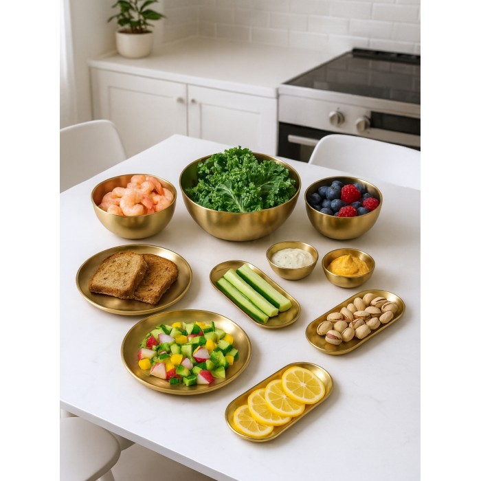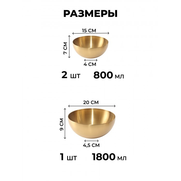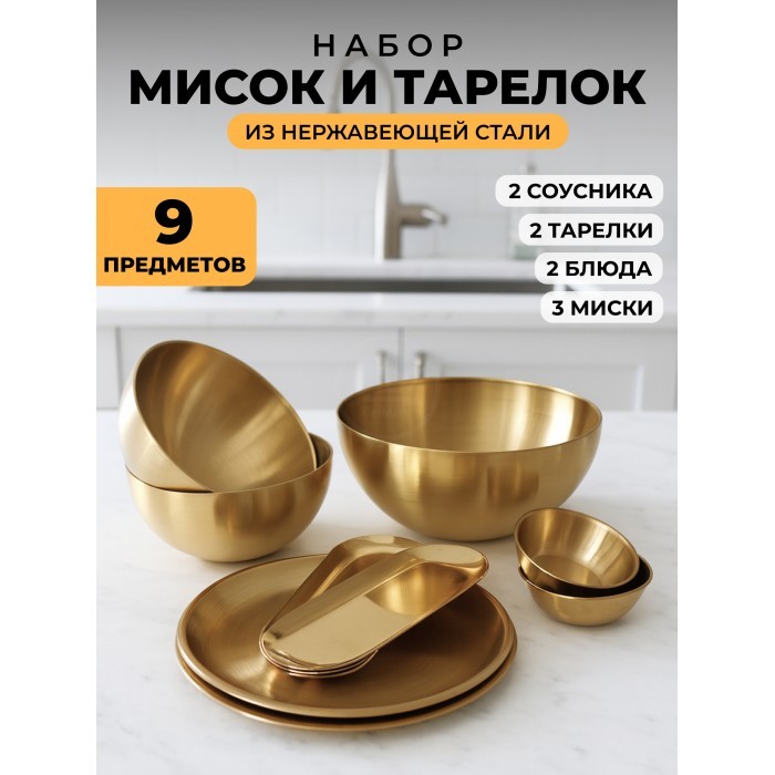 Набор Мисок из нержавеющей стали 9пред (15см- 2шт+20см-1шт+тарел 20см-2шт, бл.овал 18см-2шт, соус-2шт) золото 266206